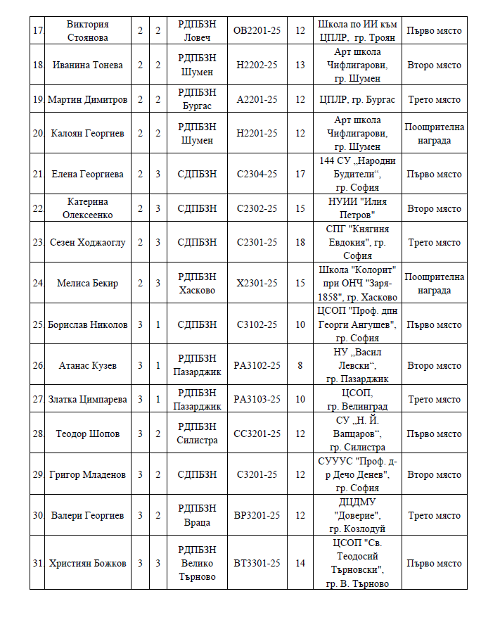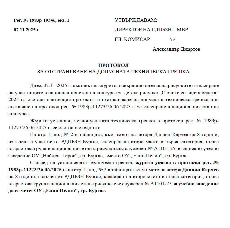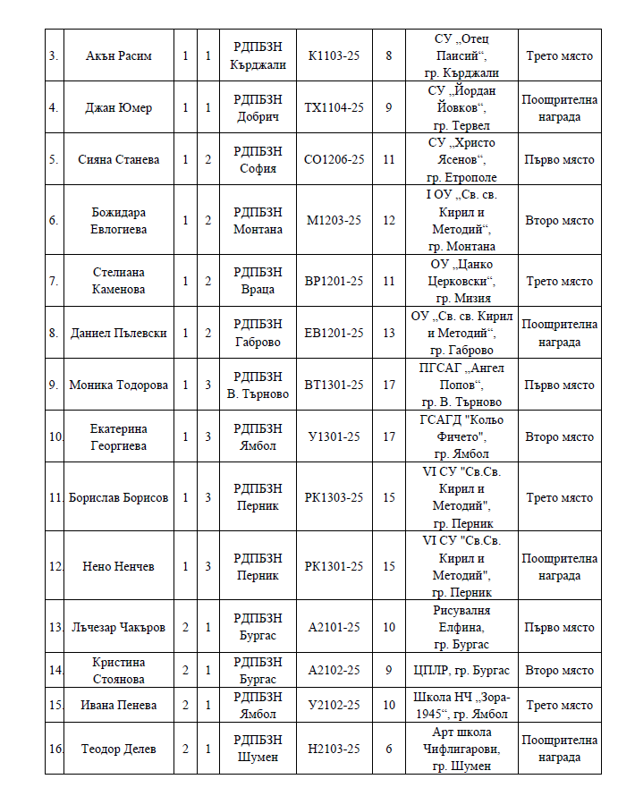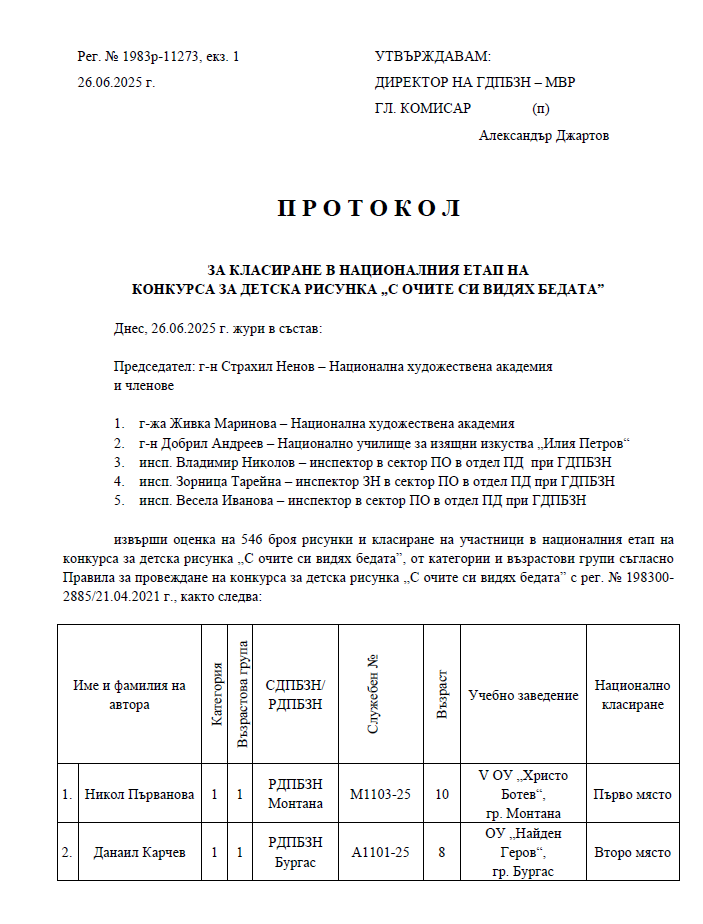 За поредна година ГДПБЗН награди младите таланти, участвали в конкурса за детска рисунка „С очите си видях бедата” – 2025 г. До финалния етап бяха допуснати 546 творби на деца от 6 до 18-годишна възраст, като 34 от тях бяха наградени на церемония в Национален дворец на децата.